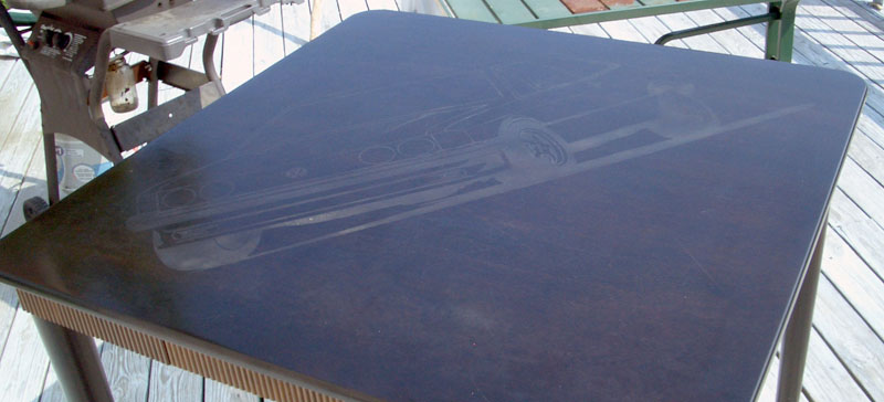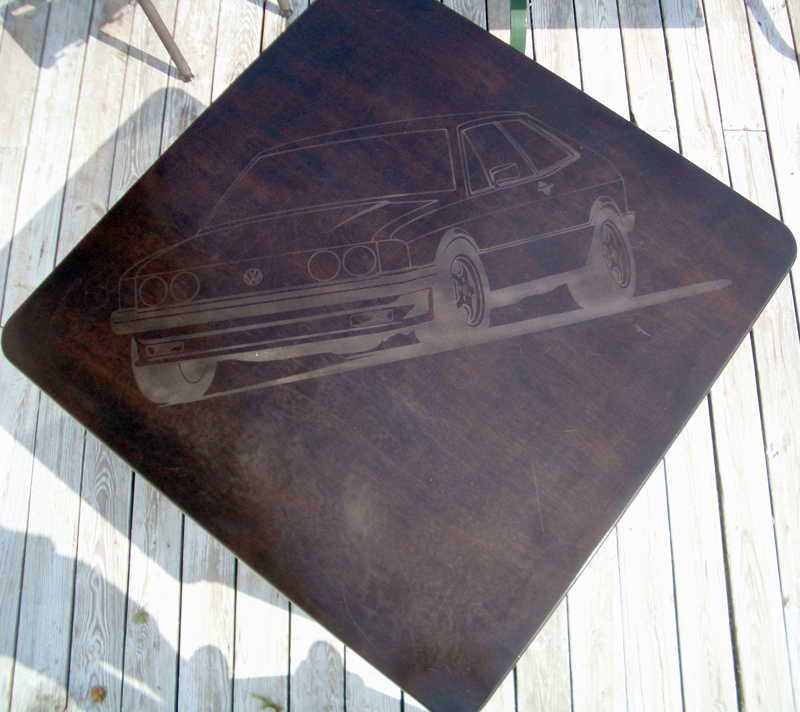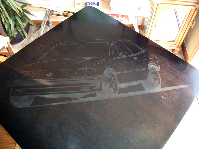 Any image that can be made from a vinyl sticker can be etched in this fashion, your furniture or mine. If you would like to send a wooden tabletop or a glass coffee table, turnaround time is typically three to five days and costs as little as $200 (not including shipping of the table top). If an appointment is made, and you bring your own piece of furniture, your etching can be done, while you wait, in about two hours. Future plans exist for a production runs of glass top coffee tables with any one of the images you see on the Vinyl Wall Art page. Please call for price and availability of these.