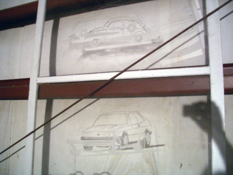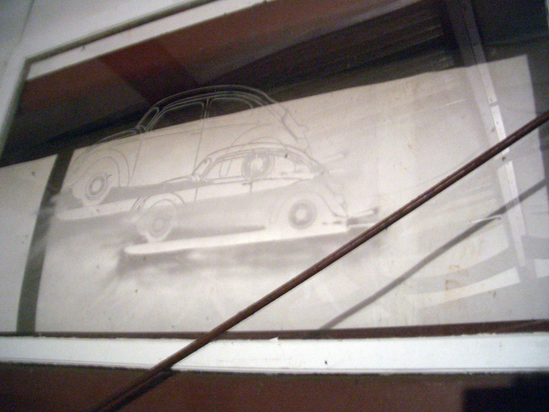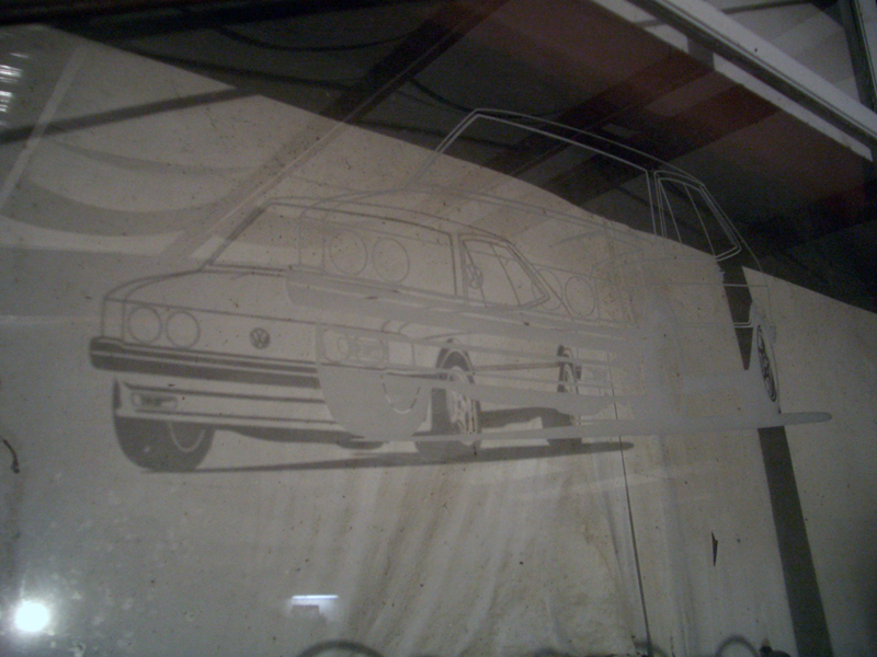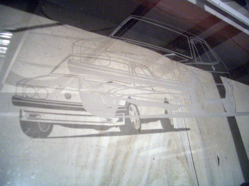 These were experimental etchings blasted into an old house window. The window is mounted on the wall of my garage. The gray areas you see on the glass are the etchings themselves, and the darker shadow of the image is what is projected from the glass onto the wall behind it. The idea is to etch an image into a glass coffee table in the same way. If a light is parked over head, it will project the image onto the floor beneath it.