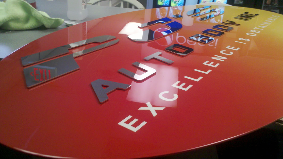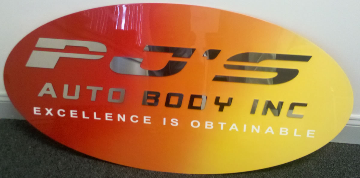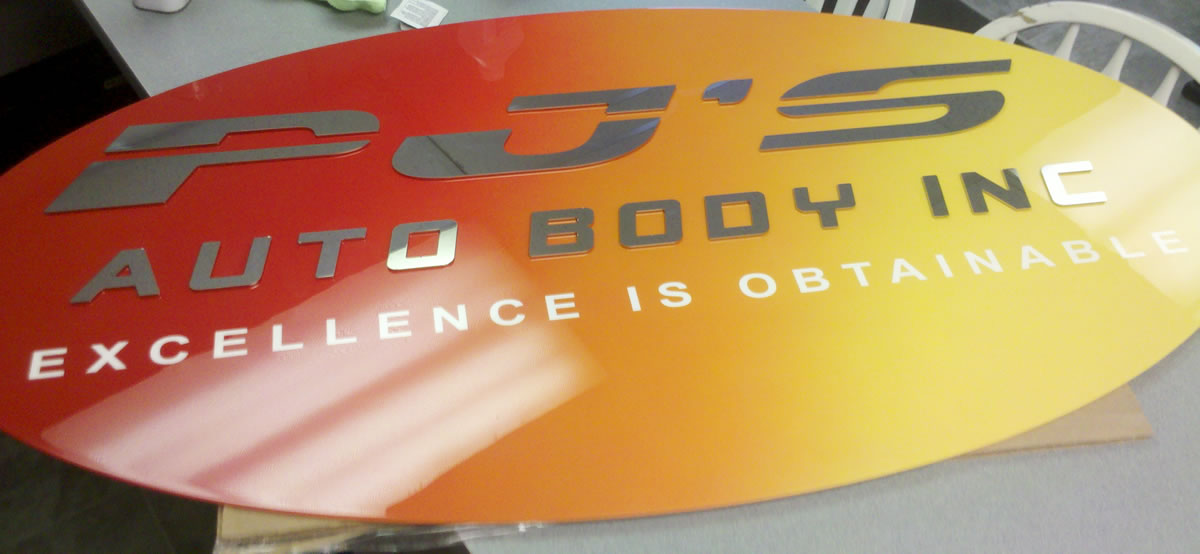 PJ's Autobody - Painted and shaded steel with mirror finished stainless lettering attached.