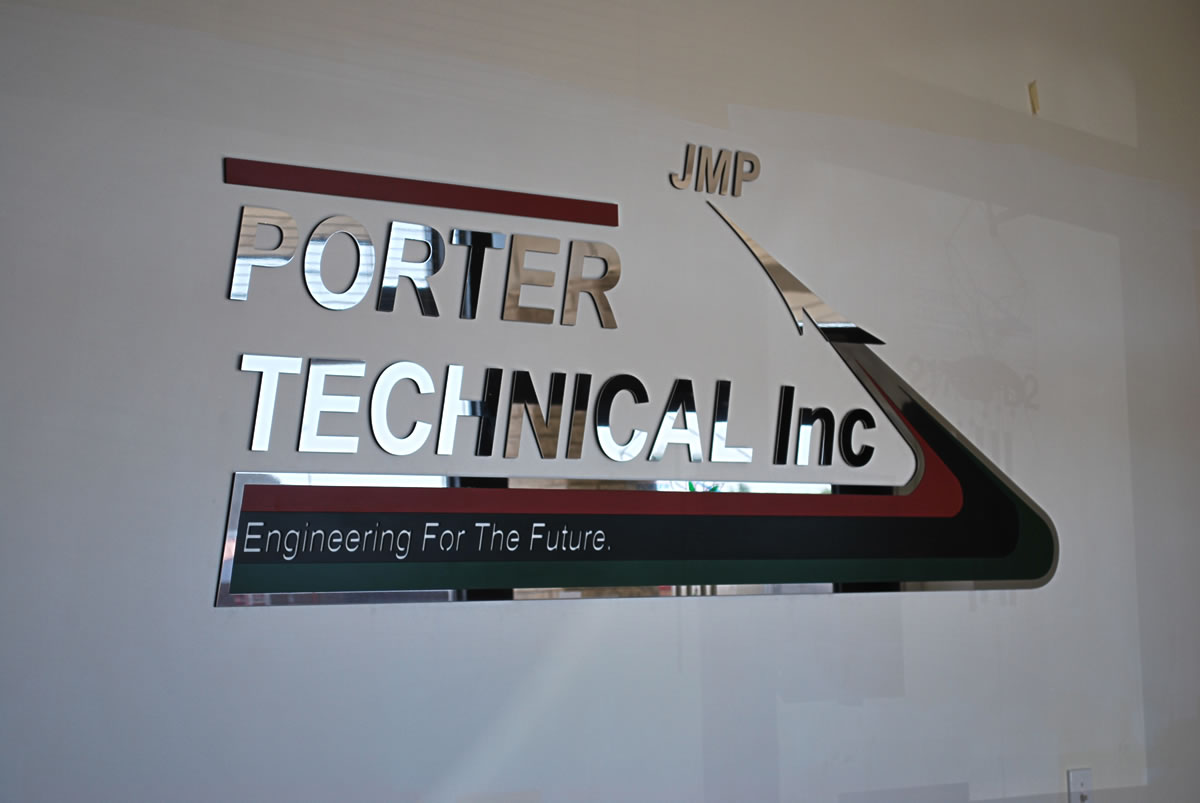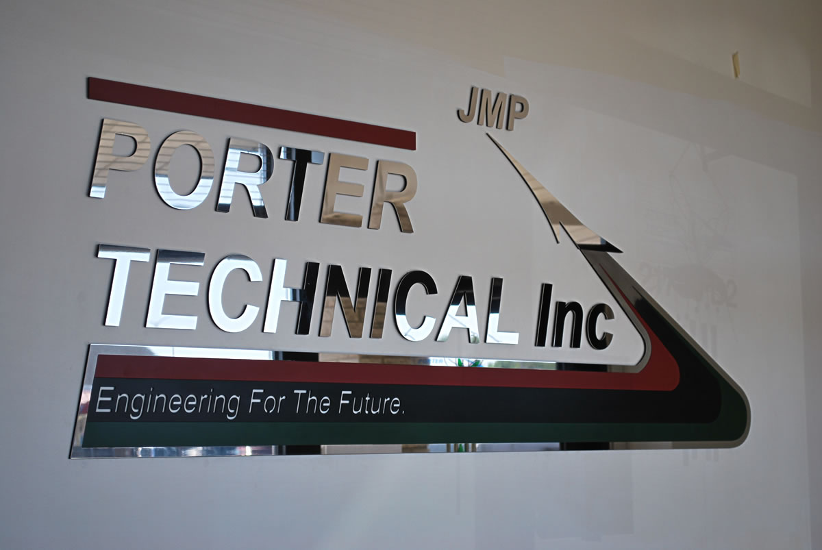 64 inches by 36 inches in a combination of mirror finished, painted and inlayed, and sandblasted stainless steel.